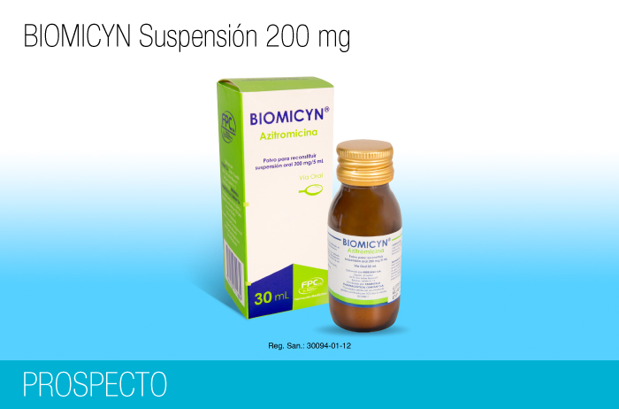 – Biomicyn 200 mg/ 5ml. Frasco x 24 g. para reconstituir 30 ml. de supensión. Sabor a frutas.