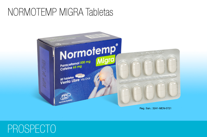 Normotemp Migra es una combinación de dos principios activos: Paracetamol antipirético, analgésico, y Cafeína que contribuye a incrementar la eficacia del Paracetamol. Indicado para el tratamiento sintomático de la fiebre y/o dolor de intensidad leve a moderada.